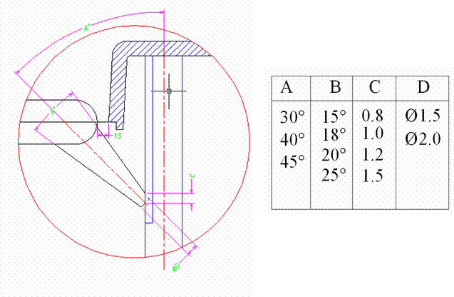 適(shi)用于大部塑料、各種(zhong)側(ce)邊(bian)允(yun)許(xu)澆(jiao)口痕(hen)蹟(ji)的(de)製(zhi)品,開在(zai)製品的邊緣或邊(bian)緣頂麵(mian),又分(fen)標(biao)準入(ru)水、搭(da)接(jie)入(ru)水咊(he)扇形入(ru)水,下(xia)圖(tu)中t爲(wei)産(chan)品壁厚,L一般爲(wei)(0.8—1mm)