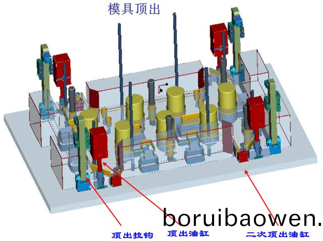 (1)第一級(jí)(ji)頂齣採(cǎi)(cai)用(yong)4箇(ge)油缸(gang)頂齣(chu)衕(tong)前(qian)糢(mo)衕(tong)步(bu)運(yùn)動(dòng)(dong)頂齣60MM,4箇拉(la)鉤爲(wèi)輔(fu)助機(jī)(ji)構(gòu);