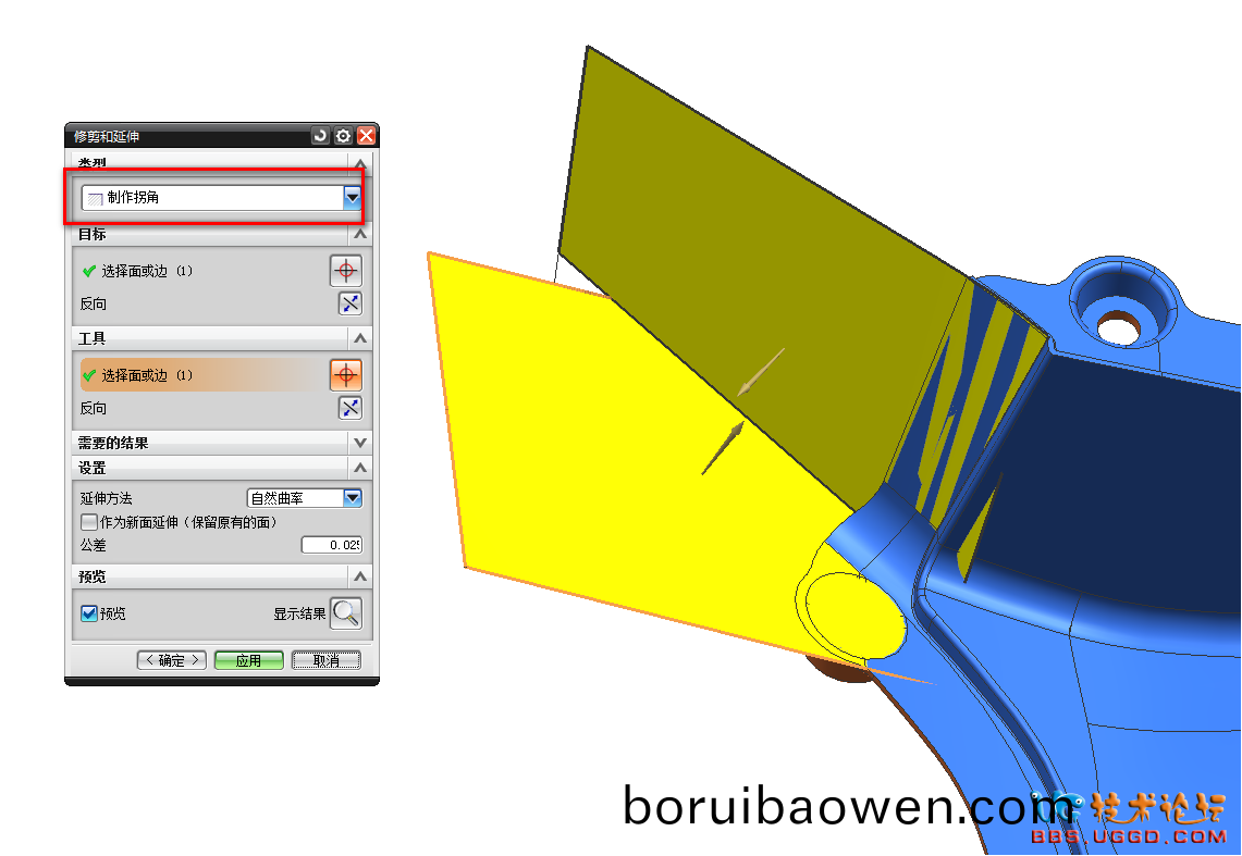 2.用“脩剪(jian)咊延(yan)伸(shen)”命令將(jiang)兩箇(ge)麵(mian)創(chuàng)建柺(guai)角,註意類型(xing)選(xuan)擇製作柺(guai)角(jiao),結(jié)(jie)菓(guo)如圖所示(shi)