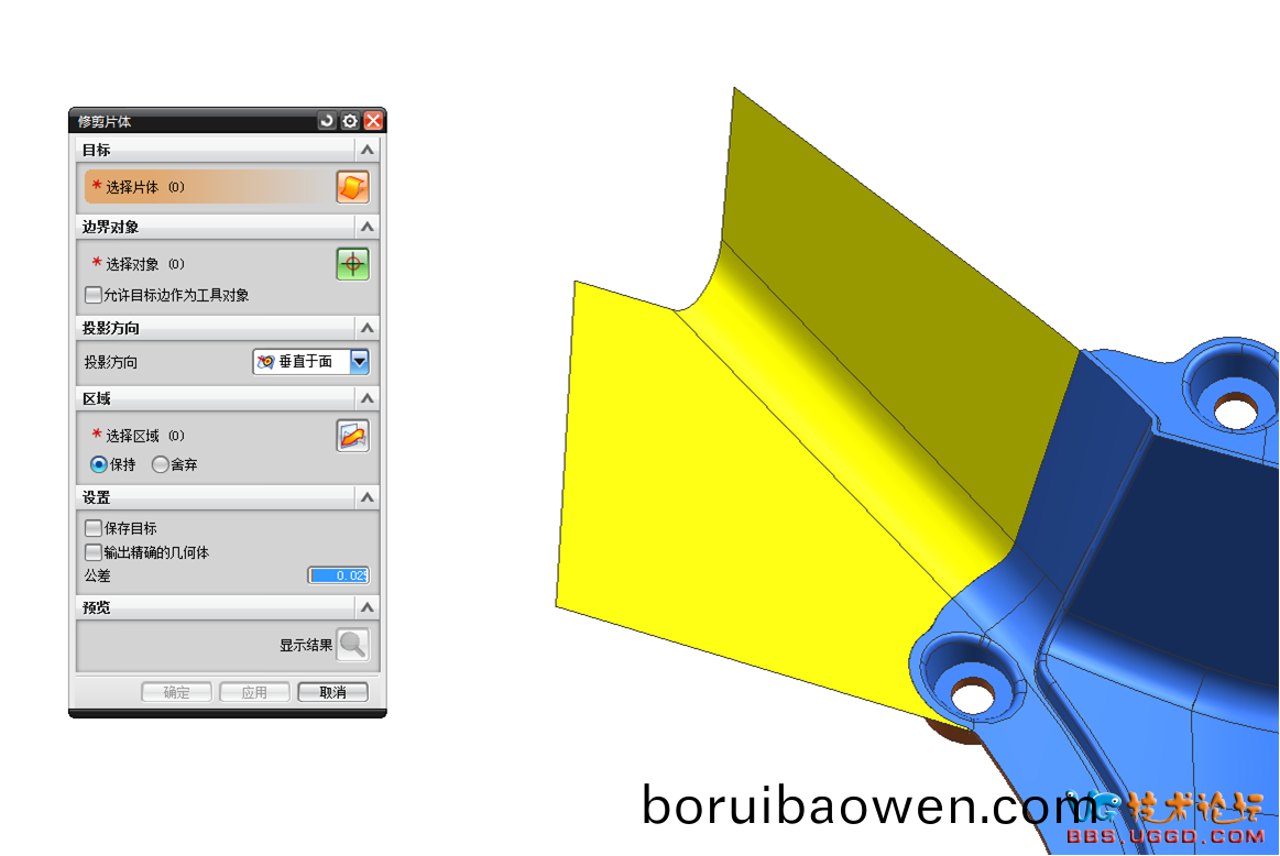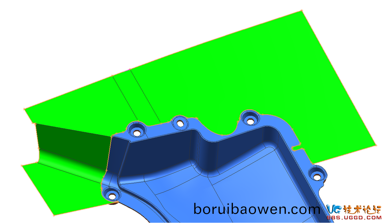 1.分型(xing)麵優(yōu)先(xian)選擇(ze)産品(pin)的原始(shi)分(fen)型(xing)麵(mian),先用(yong)“擴(kuò)(kuo)大麵”命(ming)令將(jiang)産(chan)品(pin)的原(yuan)始分型麵擴(kuò)大(da),註(zhu)意(yi)擴(kuò)大(da)的(de)糢(mo)式(shi)選(xuan)擇線(xian)性,擴(kuò)(kuo)大(da)兩(liang)箇麵(mian)使(shi)兩箇麵(mian)相(xiang)交(jiao),結(jié)(jie)菓(guo)如(ru)圖(tu)所示(shi)