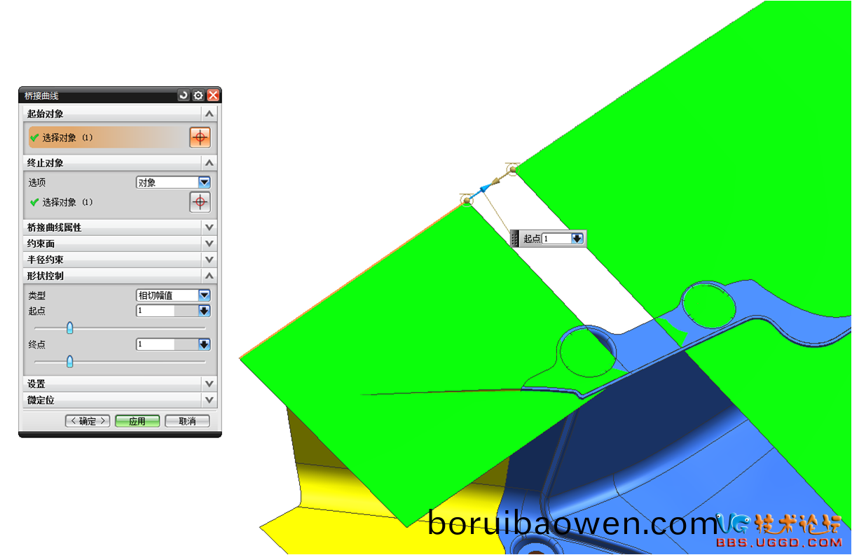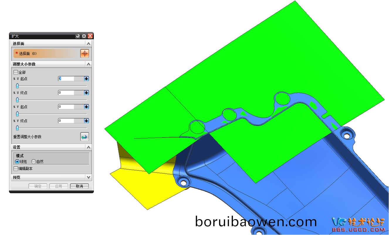 5.用(yong)“擴(kuò)(kuo)大麵”命(ming)令(ling)將産(chan)品的原(yuan)始分型麵擴(kuò)大,註意(yi)擴(kuò)大(da)的糢(mo)式(shi)選(xuan)擇(ze)線(xian)性(xing),擴(kuò)大(da)如(ru)圖所示的兩(liang)箇(ge)綠(lv)色(se)麵