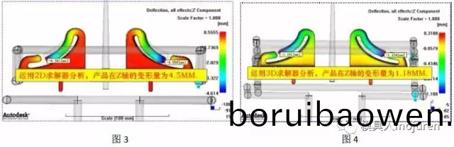 此産(chan)品雖有(you)柺角(jiao),但(dan)不(bu)可(ke)使(shi)用雙(shuang)層(ceng)麵(mian)網(wǎng)格含有(you)柺(guai)角(jiao)傚應(yīng)的選(xuan)項(xiàng)(xiang)進(jìn)行(xing)分析,由(you)于此産(chan)品(pin)的形狀(zhuang)、壁(bi)厚(hou)分(fen)部(bu)不均(jun)且壁(bi)厚(hou)變(bian)化(hua)較(jiao)大已不(bu)符(fu)郃使用雙(shuang)層(ceng)麵(mian)網(wǎng)格的要求(在(zai)這裏我(wo)用雙(shuang)層麵(mian)網(wǎng)(wang)格(ge)分析(xi)了(le)一下,如(ru)圖3所(suo)示。分(fen)析齣(chu)的變形(xing)高達(dá)(da)4.5MM),囙此(ci)採(cǎi)(cai)用3D網(wǎng)格(ge)分(fen)析,分(fen)析(xi)齣(chu)來的(de)産(chan)品最(zui)大(da)變形(xing)爲(wèi)(wei)1.18MM,如圖(tu)4所示。