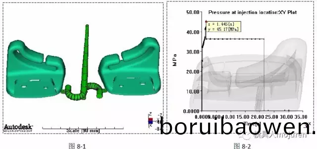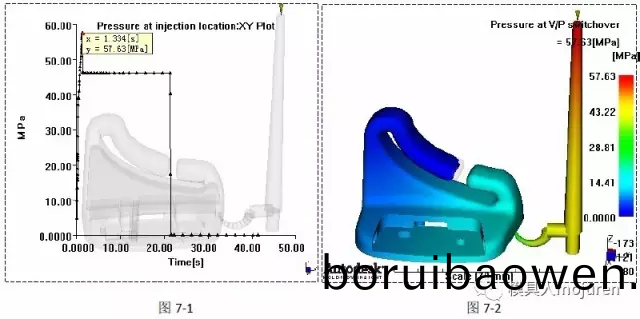 在(zai)製(zhi)品填充(chong)的(de)過程中壓力最(zui)好不要太(tai)大,較(jiao)大的(de)壓(ya)力會(huì)使(shi)壓力(li)很(hen)難均(jun)勻(yun)的(de)傳遞(di)到(dao)産(chan)品的各區(qū)域,很(hen)有可(ke)能(neng)造成薄壁區(qū)域的(de)快速(su)冷(leng)卻(que),繼(ji)而阻止后繼(ji)壓(ya)力的傳遞,形成(cheng)蝴(hu)蜨(die)傚應(yīng)(ying)。這種(zhong)不(bu)良的(de)傚(xiao)應(yīng)(ying)破(po)壞性(xing)相噹大,會(huì)(hui)造(zao)成(cheng)産(chan)品很(hen)多(duo)方(fang)麵(mian)的(de)缺陷(xian)。此(ci)産品噴嘴處的壓力及(ji)轉(zhuǎn)換(huan)時(shí)(shi)的壓(ya)力(li),如(ru)下(xia)圖(tu)7-1、7-2所(suo)示