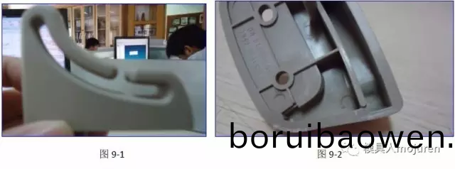 在這(zhe)裏(li)製(zhi)品(pin)仍做了1.2MM的反(fan)變形(xing),澆口(kou)由原(yuan)來(lai)的牛(niu)角(jiao)進(jìn)(jin)膠改爲(wèi)現(xiàn)在(zai)的(de)大(da)水(shui)口搭(da)底(di)進(jìn)(jin)膠(jiao),分流(liu)道改(gai)爲(wèi)(wei)了S形,可(ke)防止(zhi)主流道及(ji)分流(liu)道 的(de)冷(leng)料進(jìn)(jin)入糢(mo)腔(qiang)。實(shí)際(ji)的試(shi)糢産品如圖(tu)9-1、9-2所示,産(chan)品無(wu)變形